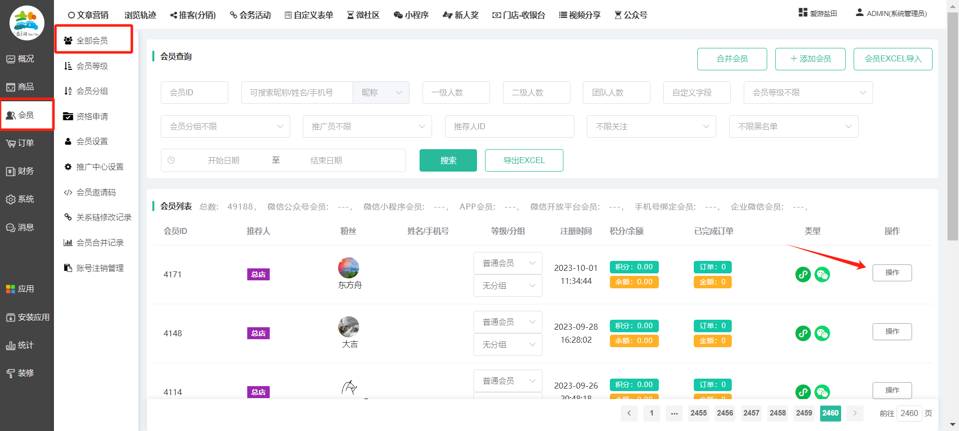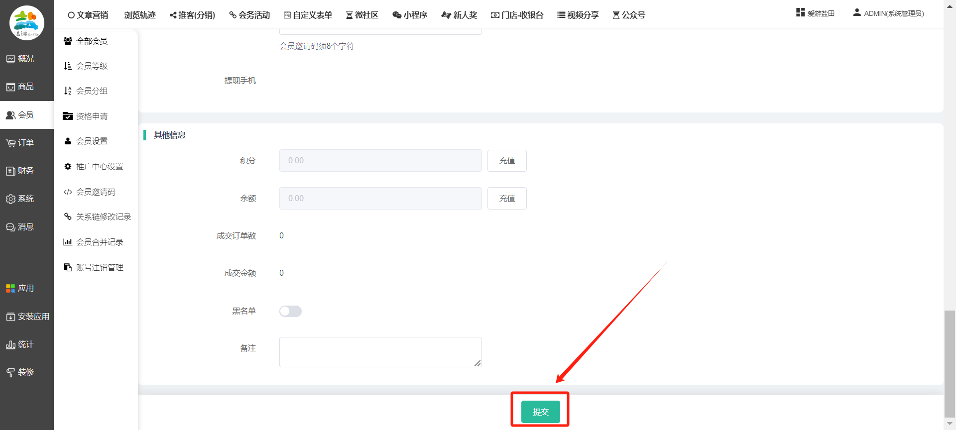 目录 搜索 展开 一、前期准备资料二、数字乡村码-上线操作指南1、服务号的申请流程及认证2、申请小程序流程3、开放平台绑定小程序和公众号三、数字乡村码-系统操作数字乡村码系统管理-概况数字乡村码-商品管理1、发布商品2、商品列表3、商品表单4、商品分类5、品牌管理6、配送模板7、评论管理8、优惠券管理9、商品标签10、退货地址设置11、满额优惠12、批量操作13、配送方式14、基础设置15、商品隐藏四、数字乡村码-会员管理1、全部会员2、会员等级3、会员分组4、资格申请5、会员设置6、推广中心设置7、会员邀请码8、会员关系链修改关系链修改记录9、会员合并记录10、账号注销管理11、会员设置中心五、数字乡村码-订单管理1、订单管理列表2、订单处理流程3、订单状态4、订单修改价格5、订单退款退货6、多包裹发货7、批量发货订单操作步骤8、催发货订单9、物流查询六、数字乡村码-财务管理1、余额设置2、会员余额3、充值记录4、转让记录5、余额明细6、收入明细7、提现设置8、提现统计9、积分管理10、转账审核11、收益广告12、批量充值七、数字乡村码-系统管理1、商城入口2、商城设置①、商城设置②、订单设置③、物流查询④、短信⑤、联系方式⑥、分类⑦、优惠券⑧、分享⑨、幻灯片⑩、广告位⑫、地图设置3、交易设置4、微信模板消息自定义消息模板(新版)自定义消息模板(旧版)小程序消息模板公众号模板消息变更公告5、语言设置6、权限管理7、多媒体管理八、数字乡村码-消息管理九、数字乡村码-应用管理十、数字乡村码系统-数据统计十一、数字乡村码-页面装修DIY1、模板管理2、店铺页面3、顶部导航4、底部导航5、DIY模板市场6、首屏广告7、基础设置8、装修DIY尺寸建议十二、供应商功能插件操作指南1、供应商2、门店-收银台门店申请和使用步骤门店管理①、门店-收银台 营销设置②、门店-收银台 分润设置门店分类门店申请门店审核门店商品门店商品订单收银台订单数据统计核销员基础设置默认设置门店装修3、微社区4、会务活动十三、营销插件操作指南活动报名提货卡新人奖微店问卷调查积分视频分享1、视频分享基础设置2、视频分享发现管理3、视频分享分类管理4、视频分享评论管理5、视频分享分红记录6、视频分享短视频中心每日红包幸运大抽奖签到优惠券二维码任务奖励优惠劵文章音频文章付费文章限时购新海报拓客卡操作流程积分活动素材中心视频红包十四、入驻门店应用类1、门店预约2、附近商品3、门店定位设置4、门店控制5、门店满额包邮6、门店满额减7、导入商品8、门店搜索9、门店股东10、核销券11、多门店核销1、商城后台设置2、前端功能演示十五、常见问题1、后台登录密码修改流程2、会员-余额,积分,后台如何进行充值与扣除3、如何修改上下级关系4、一种万能的获取商城小程序路径的方法 暂无相关搜索结果! 阅读次数:1620 本文档使用 模王系统 发布 8、会员关系链修改 8、会员关系链修改一.如何修改上下级关系?1.会员-全部会员-可以通过搜索用户的独立ID,或者用户微信昵称,找到此会员,然后点击右边的(操作)2.再点击会员详情。3.滑到下面,有个推广信息-会员上线,点击修改4.输入上级的ID号,点击搜索,出来此上级会员后点击选择。5.滑到最下面,一定要点击提交按钮。文档更新时间: 2023-11-30 14:56 作者:链上旅行